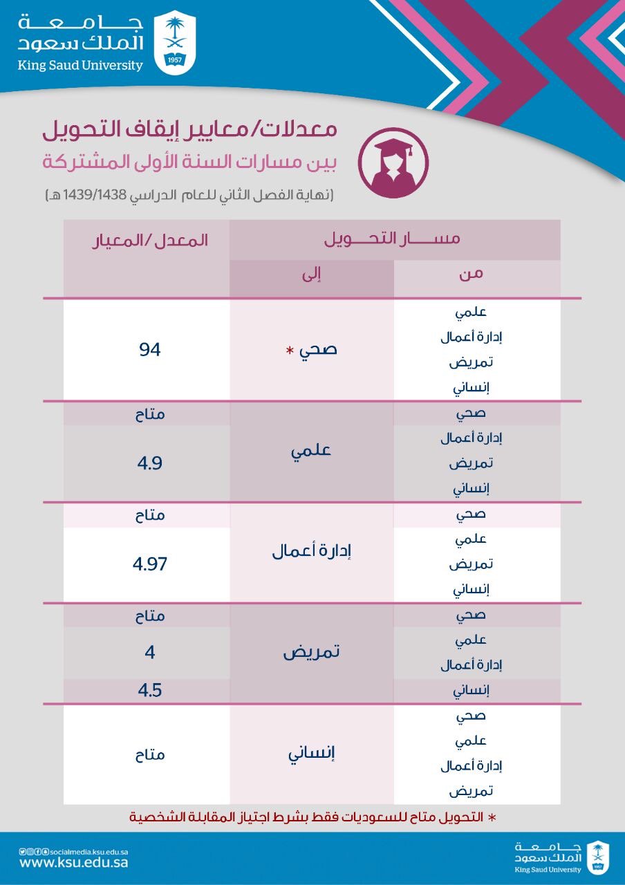 يسر عمادة شؤون القبول والتسجيل بجامعة الملك سعود أن تعلن نتائج تخصيص طلاب وطالبات السنة الأولى المشتركة بعد نهاية الفصل الدراسي الأول 1439 1438هـ. 1437 1438 1438 1439هـ 1439 1440. كيفية حساب النسبة الموزونة لجامعة الملك سعود تعتبر عملية حساب النسبة الموزونة داخل جامعة الملك سعود من أهم العمليات التي تساعد على الالتحاق بهذه الجامعة وذلك بعد حصول الطالب أو الطالبة على شهادة الث. مسار الكليات الصحية طلاب الكلية القسم 1437 1436 1438 1437 1439 1438 1440 1439 1441 طب الأسنان 91 45 93 21 91 36 91 86 93 97 الطب 93 14 95 04 94 70 94 82 95 21 الصيدلة 87 54 88 94 84 98 84 02 90 63 العلوم الطبية التطبيقية دكتور بصريات 90.
