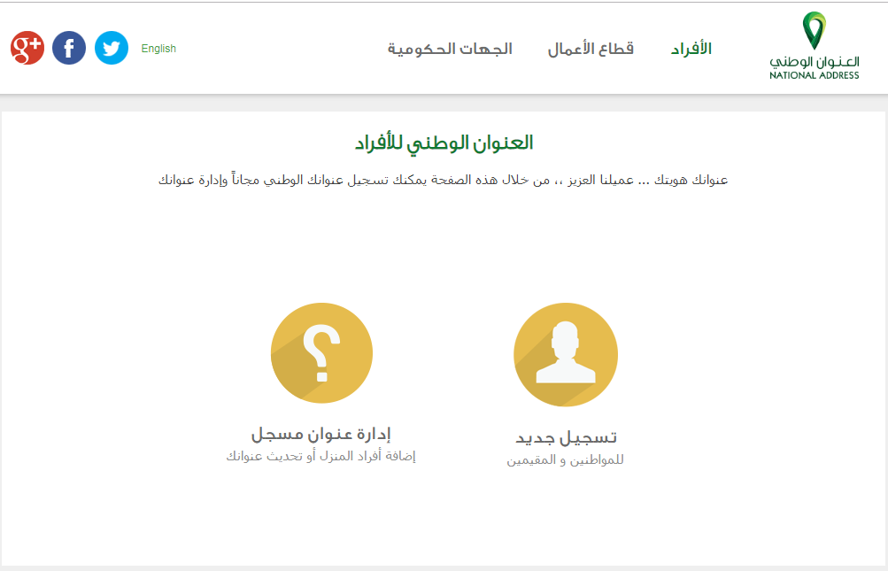 عميلنا العزيز من خلال هذه الصفحة يمكنك تسجيل عنوانك الوطني مجانا وإدارة عنوانك. تسجيل العنوان الوطني الشروط والأحكام يتم نشر وإدارة هذه البوابة الإلكترونية من قبل مؤسسة البريد السعودي. تسجيل العنوان الوطني عنوانك هويتك. 22622 الرياض 11416 هاتف 4013030 11 966 العنوان الوطني.