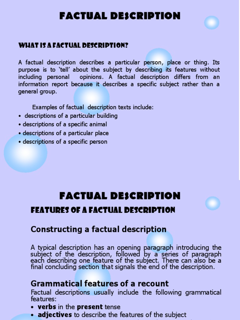 While writing a factual description follow these general rules. The appropriate format and style must be followed. Sights sounds smell 6. Factual description people duration.
