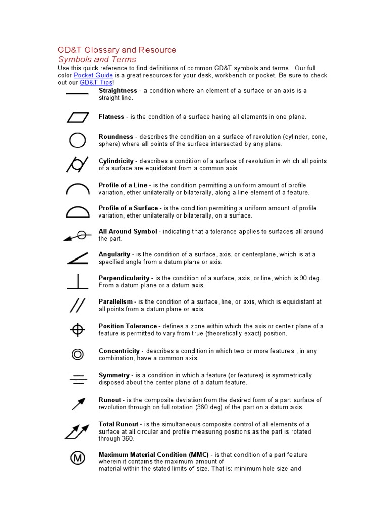 Gd and t symbols definitions. Designers and engineers utilize this international language on their drawings to accurately describe part features on the basis of size form orientation and location. Yes mmc or lmc applicable. Geometric dimensioning tolerancing gd t sometimes refered to as gdt is a set of standard symbols which are used to define parts and assembly features and their tolerance zones in dimensioning engineering drawings. The symbolic language in gd t describes the geometry and allowable variation or error it can specify the requirements of accuracy and precision of the cnc machining parts.